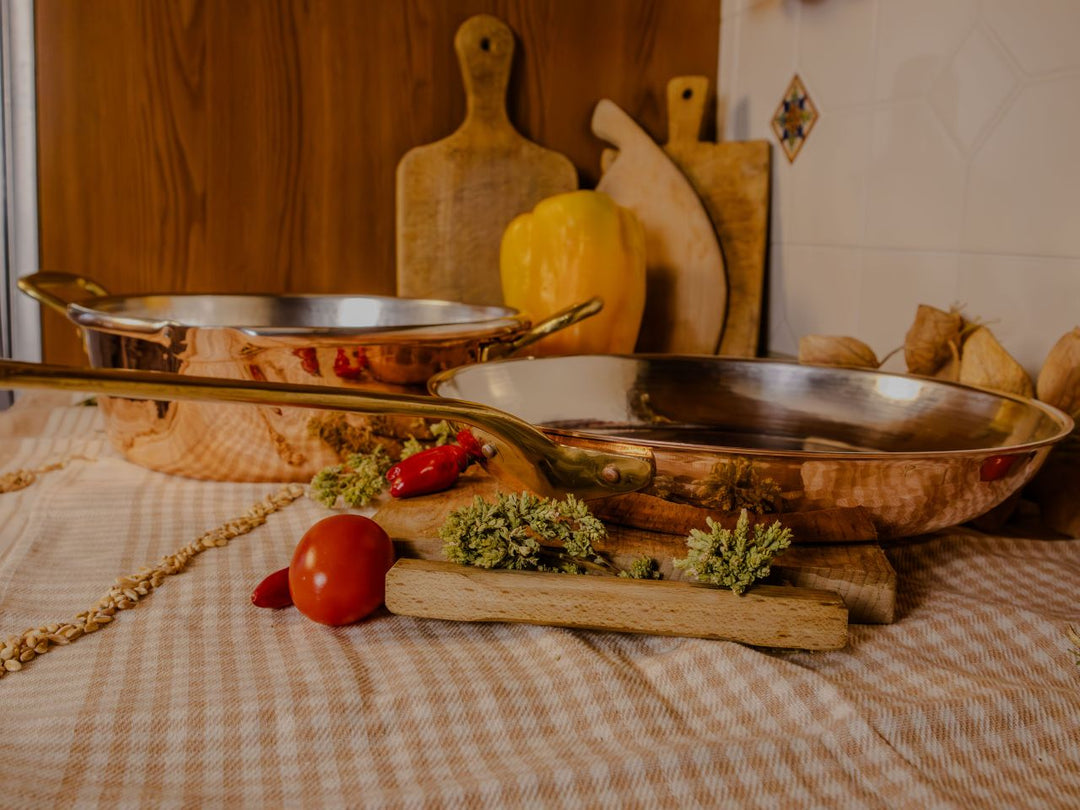 Artigianato Italiano di Alta Qualità Questo Tris essenziale in rame stagnato è l’alleato ideale per la cucina quotidiana. Realizzato a mano con cura e passione da noi, artigiani italiani. Ciascun articolo è caratterizzato da uno spessore importante, conferendogli robustezza e solidità. Il rame massiccio garantisce una distribuzione uniforme del calore, assicurando risultati eccellenti in ogni preparazione.